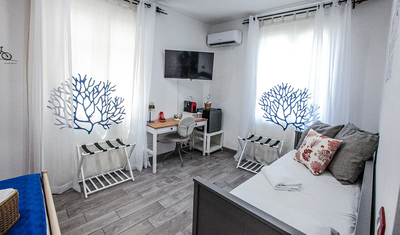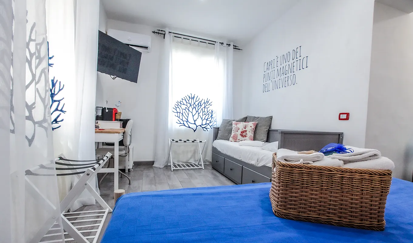 La camera, ampia e luminosa, è arredata con gusto e richiama nei colori e nei dettagli l’eleganza mediterranea dell’isola di Capri. Dispone di quattro comodi posti letto, distribuiti in modo da garantire spazio e libertà di movimento a tutti gli ospiti. Il bagno privato, moderno e funzionale, è dotato di tutti i comfort necessari per un soggiorno piacevole.